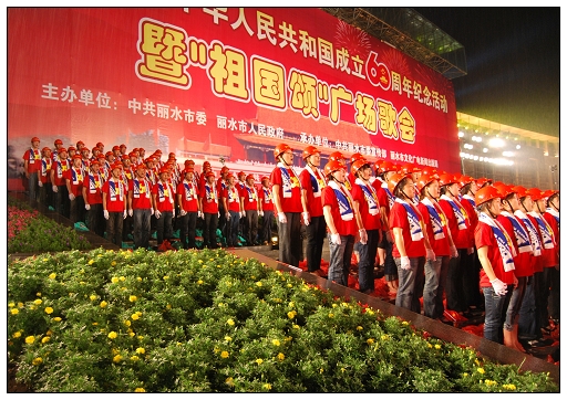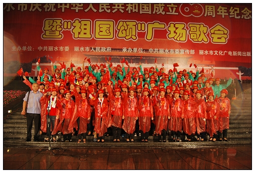 麗水市慶祝新中國成立60周年紀念活動暨“祖國頌”廣場歌會隆重舉行。歌會分革命英雄贊、建設新中國、走進新時代三個篇章進行。15個方陣依次進行大合唱,每個方陣各唱一首歌。