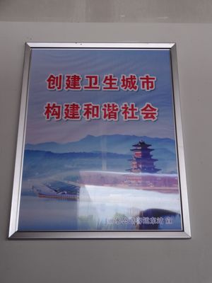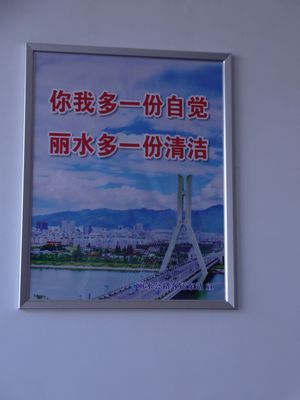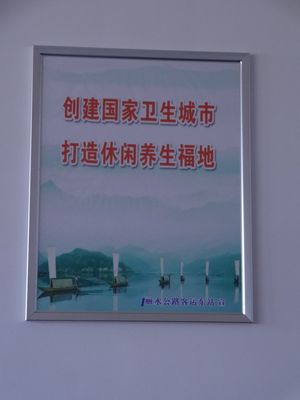 現在,墻上懸掛的是創衛口號與麗水山水風光相結合的宣傳畫,賞心悅目。