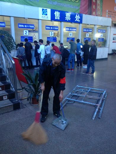 近段時期,客運東站正如火如荼的進行著創衛,各部門,各崗位都把創衛當作頭等大事來抓,不敢有一絲的懈怡。我們的老同志也不甘人后,他時常在工作的間隙出現在候車大廳,一會兒撿個雜物、一會兒夾個煙頭、一會兒耐心的勸導旅客不要亂扔垃圾???!當他發現候車室值班室因裝修留下了一些白色粉塵,就趕忙拿起掃帚,將這些死角清理干凈。他的干勁一點也不輸給那些剛參加工作沒幾年的小年輕。當我給他拍照時他還很不好意思的用背部躲閃著我的鏡頭。一邊還說著:“不要拍我!你去拍那些做的更好的同志”!