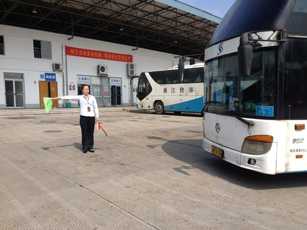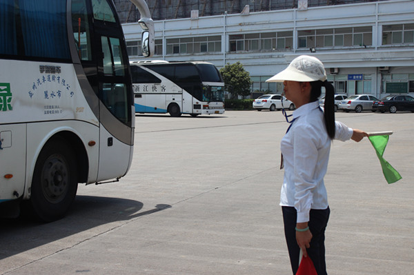 正午時分,行車員們頂著烈日,揮動著紅綠旗,認真地為車輛引航,安全及時地送出一撥撥旅客。愛美之心人皆有之,行車組的姐妹們也不例外,可是為了發車安全,一件長袖襯衫、一頂遮陽帽就是她們面對毒辣太陽的全副武裝。