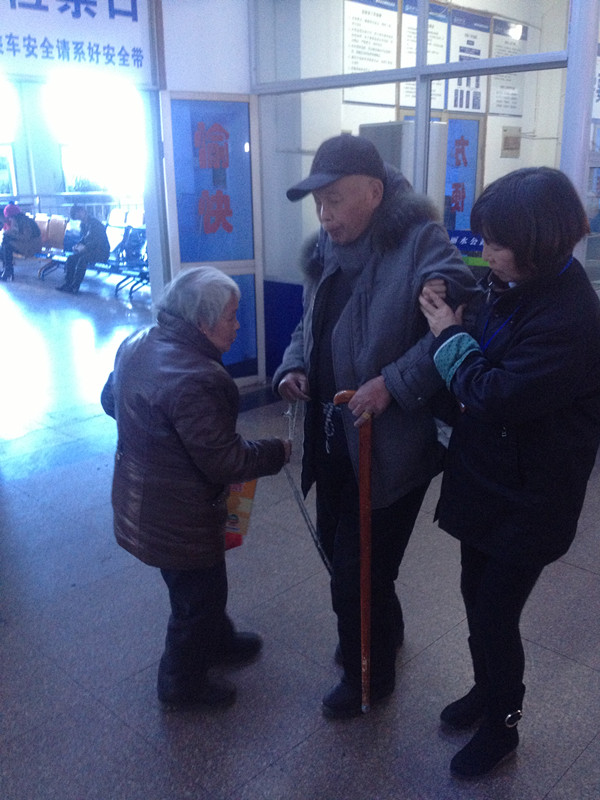 在終于走到13號檢票口后,蔡美娟趕緊扶著老大爺坐下,讓老大爺先休息一下,自己快步走到檢票口對檢票員王佩瑤交代了兩位老人班車的時間和車次,又轉身和老兩口說:“你們放心好了,我都交代好了,待會時間到了檢票員會扶您上車的”兩位老人感激的說:“謝謝你!謝謝你!麻煩你了!”蔡美娟說:“這都是我應該做的!”說完就返回了自己的崗位繼續工作。