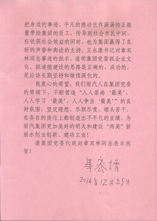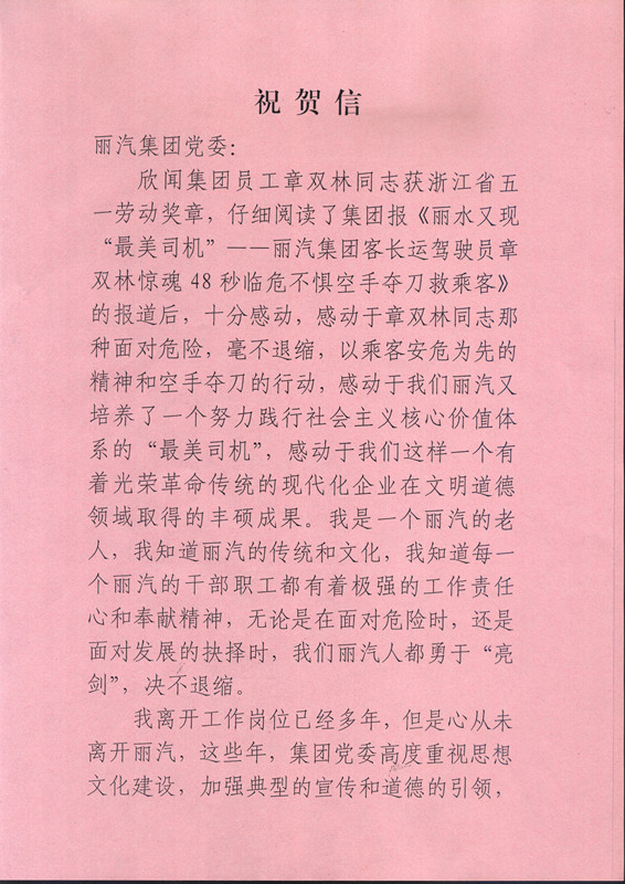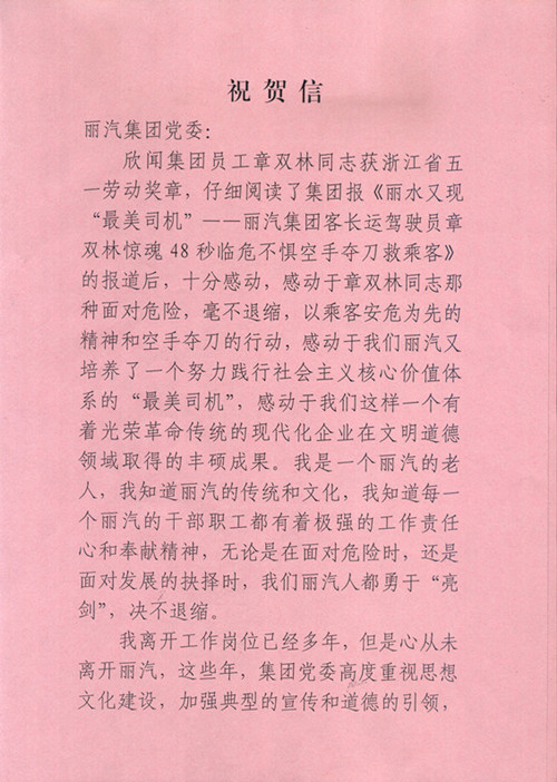 集團公司客長運司機章雙林臨危不懼空手奪刀的先進事跡,不僅受到全社會的高度關注,在感動著社會、感動著廣大員工的同時,也感動了離退休老同志。25日,集團公司離休干部、年逾90高齡的畢密增同志專門發來賀信,高度肯定了集團公司的思想文化建設,也表達了對章雙林的祝賀。