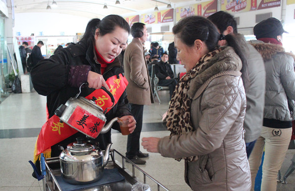 2月6日一大早,客運西站“流動之家”服務班的姐們早早就準備好一大壺熱騰騰的姜茶,免費送到候車的旅客手上,希望熱騰騰的姜茶能驅散早晚的寒意,讓旅客回家的旅程變的更加溫暖。