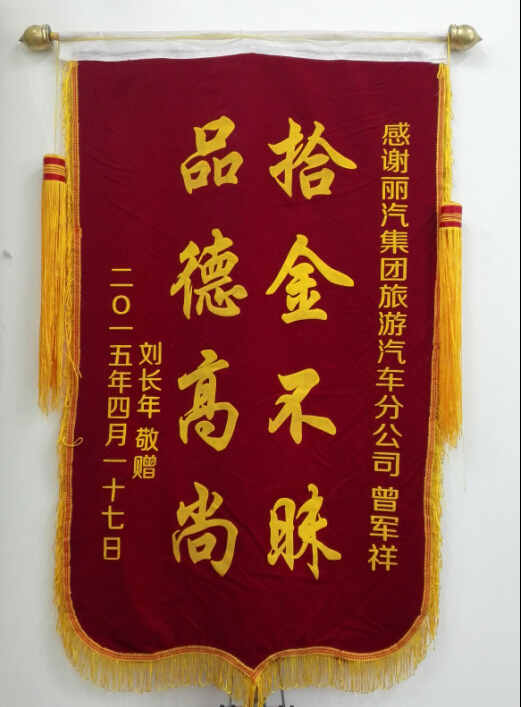 旅客劉長年回顧說,自己在4月15日來麗水市委黨校開會,會議包的是麗汽集團旅游汽車分公司的車。晚上會議結束以后就直接下車了,當時也沒有留意自己的錢包丟在車上,后來到了賓館才發現自己錢包丟了,十分的著急,因為自己是華僑,包里面的很多卡十分的重要,而且補辦起來很困難。后來問了經辦人才得知駕駛員的電話。第2 天來到麗汽集團旅游汽車分公司的時候,發現自己的錢包已經安安全全的放在前臺工作人員那里了。我當時拿了500塊錢想感謝駕駛員,但是好心的駕駛員婉言拒絕了,就說了句“這是應該做的”。我想想還是做點實際的來表示我對這位拾金不昧、品德高尚的駕駛員的謝意,所以就送上了這面錦旗。