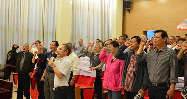 展廳參觀完畢,老黨員們移步到觀影廳,對著黨旗,大家重溫了入黨誓詞。仔細聆聽了離退休黨總支副書記張國軍向大家傳達的《董事會工作報告》。隨后,大家觀看了《烽火浙西南》影片。