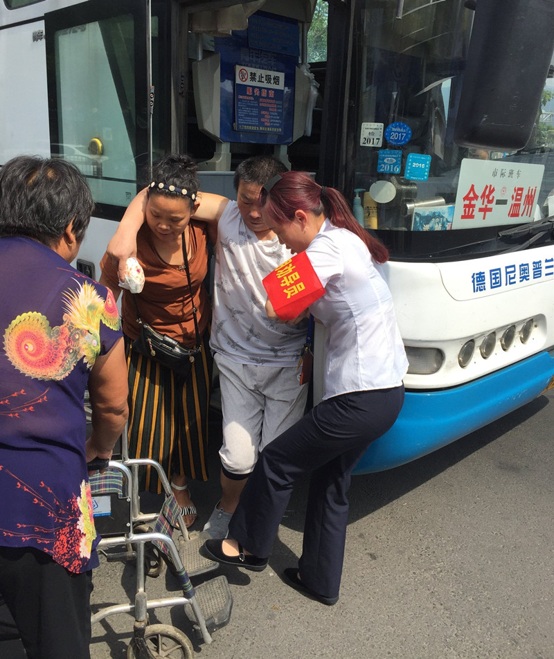 9:35金華到麗水的班車緩緩地駛進了高鐵配載點。車一停穩,旅客們便陸陸續續的下車前往下一個目的地。眼尖的江旭紅看見一位中年婦女在車門處很吃力的拉著什么,江旭紅心想,車上可能有行動不便的旅客需要下車。江旭紅全然不顧烈日的暴曬,毫不猶豫的迎上前去。果不其然,車門處的阿姨和車上的另一個阿姨正連拉帶抱的幫一位行動不便的大叔下車。大叔看上去50多歲的樣子,因為得了某種疾病一點都不會做自主的動作,全憑兩位阿姨慢慢地挪動,160多斤的體重給兩位阿姨扶他下車增加了不少的難度。才移下一個臺階,汗珠已經順著兩位阿姨的臉頰往下淌。江旭紅立即從行李倉拿出他們隨車攜帶的輪椅撐開,放在車門旁。由于車子臺階處較窄,站不下其他的人,江旭紅就在車下位置幫著把大叔的腳抬起來,待大叔被移到最后一級臺階時,江旭紅順勢托起大叔的一只手,和車上那位阿姨一起,使盡渾身力氣一步一步慢慢地把大叔架到了輪椅上。接著江旭紅又把大叔送到陰涼處,等待家人來接。這時的江旭紅已是滿頭大汗,背上的衣服都濕透了。