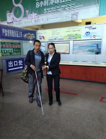 看著盲人旅客緩慢而迷茫的步伐,應安怡準備上前扶他進站,可自己窗口前還有正在排隊購票的旅客呢,應安怡靈機一動,叫來了正在服務臺上班的江旭紅。