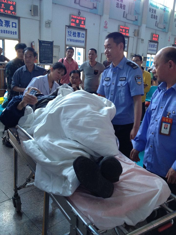 5月8日下午16:00左右,東站保潔員吳麗君在打掃候車室的男廁所衛生時,發現一位80多歲、老人身著病號褲的老人家呼吸困難、面色暗黃地倒在廁所內。吳麗君急忙上前詢問,老人目光無神,神志不清,已經說不出話了。