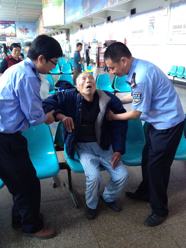 見此情況,吳麗君立即通知了駐站派出所。檢票員施筆婷經過此處,得知情況后急忙向當班值班站長匯報,一邊撥打了120。聞訊趕來的派出所民警張冰等人將老人扶出衛生間。隨后120趕到,東站工作人員協助120將老人抬上救護車,送往麗水中醫院救治。為能盡快聯系上老人的家人,民警檢查了老人的隨身物品,可是沒找到任何有用的信息。目前,有關方面正積極努力通過其他途徑查找老人的親屬。